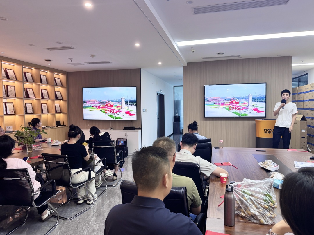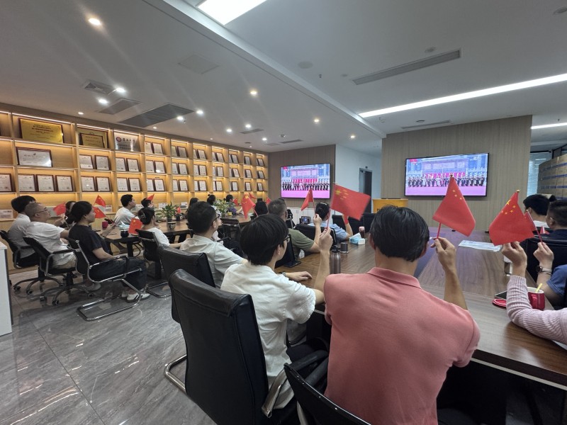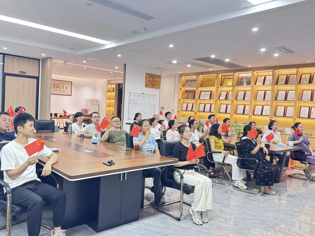 观看现场气氛庄严热烈,员工们手持五星红旗,全程专注收看阅兵盛况。仪式开始时,全体起立,目光凝视屏幕,高唱国歌,认真聆听习近平主席发表的重要讲话。